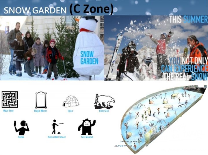 真雪、鋪墊厚度達 50 厘米,配合場內歐洲村莊佈置將雪國氣氛帶到澳門。場內設有三個大型真
