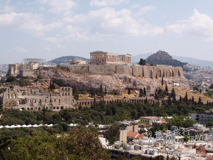 雅典衛城(ACROPOLIS)位於雅典市中心西南部,雄踞150多米高的衛城山丘之巔,是城市的地標和古希臘的象徵。衛城始建於公元前580年,Acropolis在希臘語中意為“高處的城邦”,山丘的東、南、北三面都是懸崖絕壁,可謂是一道天然屏障,曾作為堅固的軍事要塞,人們一般從西側主入口進入衛城。進入衛城景區首先要經過布雷之門(Beule Gate),是以發現它的法國考古學家Ernest Beule之名命名的。沿著通向山門的坡道繼續上行,在左手邊可以看到一個高達8米的基座,上面曾經有過阿格里帕(Agrippa)紀念碑,是一尊羅馬將軍駕駛戰車的銅像。