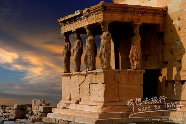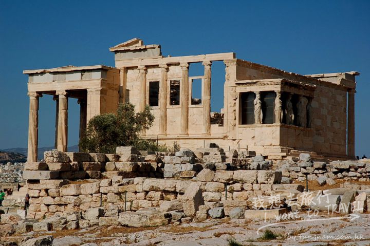 伊瑞克提翁神殿,位於巴特農神殿的北面,建於公元前 395 年,內部有一座雅典娜的木雕像,在這座神殿南側廊台的六尊女像柱(Caryatids),是屬於愛奧尼亞式的變形;現在的優美女像列柱結構完美, 不至讓視覺上產生不自然的現象,不過由於空氣污染,這些並非真品,只是由複製品取代,遊客要看真品就要到衛城博物館及倫敦的大英博物館。 傳說這裡是雅典娜女神和海神波塞東為爭做雅典保護神而鬥智的地方,本為放置八聖徒遺骨的石殿,是雅典衛城建築中愛奧尼亞樣式的典型代表,建在高低不平的高地上,建築設計非常精巧。神殿東區是傳統的 6 柱門面,向南採取虛廳形式 ;南端用 6 根大理石雕刻而成的少女像柱代替石柱頂起石頂,充分體現了建築師的智慧,她們長裙束胸,輕盈飄逸,頭頂千斤,顯得亭亭玉立。