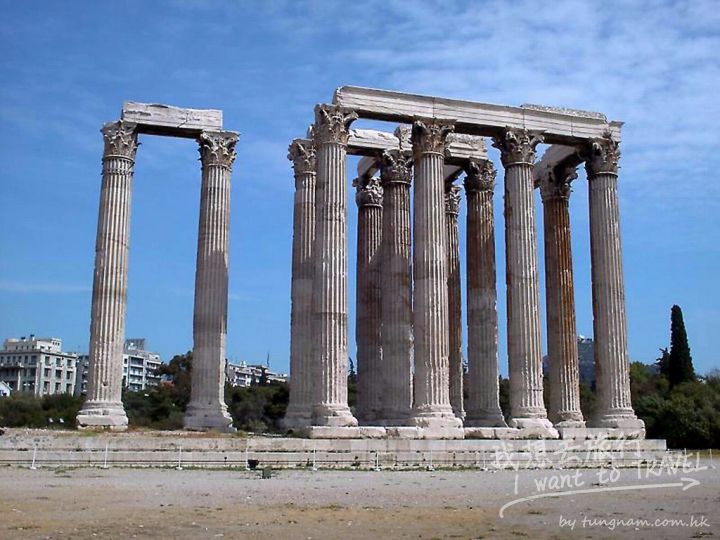 奧林匹宙斯神殿(TEMPLE OF OLYMPIAN ZEUS)位於奧林匹亞村,是為了祭祀宙斯而建的,也是古希臘最大的神殿之一。宙斯神殿建於公元前470年,於公元前456年完工,由建築師立本(Libon)設計,宙斯神像則由雕刻家菲狄亞斯(pheidias)負責。直到公元前86年,羅馬指揮官蘇拉(Sulla)攻占雅典,破壞了尚未完成的建築,將一部分石柱和其他建材拆下來之後,運到羅馬。直到今天,在羅馬市中心的古羅馬廣場遺址上,還能看見它們。宙斯神殿曾以像牙和黃金的塑像而聞名於世,但如今已無法一睹其真跡。宙斯神殿的基座為64×28米,寬邊有6根立柱,長邊有13根立柱。它是歐洲古代早期最重要的建築之一。神殿表面舖有灰泥的石灰岩,殿頂則用大理石興建而成。廟前廟後的石像都是用派洛斯(Paros)島的大理石雕成。神殿內西邊人字形簷飾上的很多雕像,十足是雅典的風格。