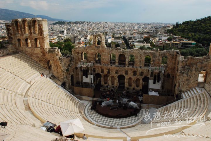 狄奧尼索斯露天劇場(THEATER OF DIONYSOS),劇場位於雅典衛城南面,形狀屬半圓形,西側的 Odium of Herodes Attius 劇場現在仍然是夏季露天音樂會和戲劇表演的場所,東側的酒神劇場則向遊客開放。該劇場建於公元前 5 世紀,是早期向酒 神祈禱的地方。 這個足以容納 17000 人的劇場曾經上演過無數場埃斯庫羅斯、索福克勒斯和歐里庇得斯的悲劇作品及阿里斯托芬的喜劇作品,劇場依山坡而建,大得驚人,就似凝結了天地大美之氣。 由於希臘戲劇都是在白天演出,所以從觀眾席上能看到鄉村的壯麗景況,但戲劇本身的張力使觀眾的注意力無法離開主題轉向背景。希臘人認為看戲意謂著某種「 激情般的快樂 」,在 2500 多年後的今日,劇場上的座位和舞台還大致完整, 因此古劇的演出和雅典藝術界的頒獎依然在這裡舉行。