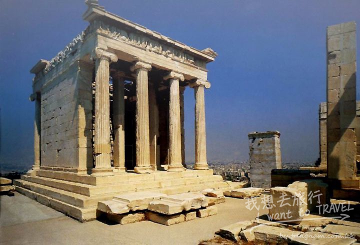 勝利女神殿(TEMPLE OF ATHENA NIKE) 位於雅典衛城的西南側,坐落於一個陡峭而突出的平台上。這裡曾用來安置被剝奪了翅膀的勝利女神尼基之像,神殿由此得名。勝利女神殿建於公元前427-424年間,以此紀念雅典人在波斯之戰中取得勝利。這座小巧精緻的神鵰由帕特農神廟的設計者之一卡利特拉提斯(Kallikrates)主持修建,在之後的戰亂中,勝利女神殿屢遭浩劫,其屋頂和部分裝飾物已被損毀,但神殿的主體結構依舊被完整地保存下來。目前僅可從外面一睹神殿風采,無法入內參觀。神殿長約8米,寬約5米,用大理石建成,內殿呈方形。神殿面向東方,東西立面各有四根娟秀的愛奧尼亞式圓柱,柱頭帶有標誌性地漩渦標誌,倘若一條精美的腰帶。殿內曾經保存有勝利女神尼基的雕像,根據文獻記載,女神像由木頭雕製而成,左手持頭盔,右手握石榴,和盧浮宮的勝利女神像不同是這尊雕像並沒有翅膀,雅典人試圖用這種方式將勝利女神永遠留在這座城市。神殿東側的裝飾帶上雕刻著雅典娜、宙斯、波塞冬等希臘諸神的雕像,其他地方均刻畫了雅典與波斯人戰鬥的場面。在神殿竣工後的公元前410年間,神殿周圍修建起了護欄,以防止人們墜入懸崖。護欄上也刻有玲瓏剔透的浮雕,表現女神尼基的日常畫面。