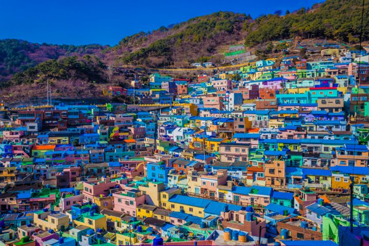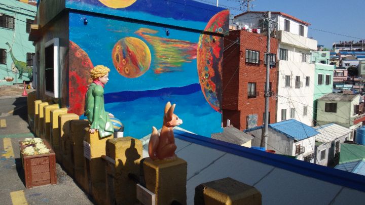 甘川文化村起初是1950年代韓戰時中,難民們的安身之處。順著山勢建著高高低低的房子以及狹窄的小巷,這些都在美術改造企劃下變身成五顏六色的童話世界,而這裡也因此得名「釜山的聖托里尼」。