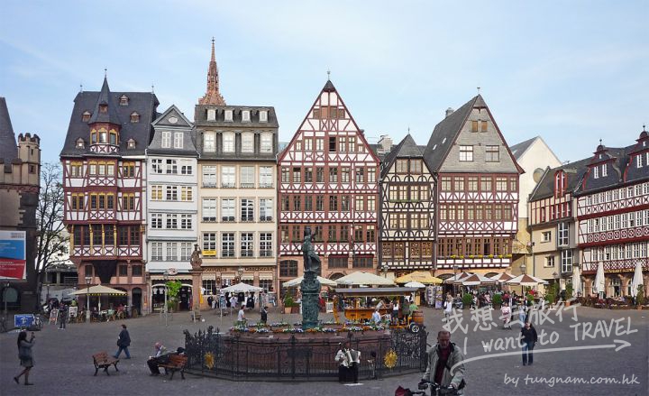 羅馬廣場(ROEMERBERG),是法蘭克福老城的中心,最早這裏是城市的集市中心。到中世紀時成為城市裏最大的廣場。廣場的名字來源於廣場西面叫羅馬廳的三個連體的哥特式樓房,最具特色的是樓頂的人字型山墻。如 今作為法蘭克福的市政廳。樓房的二樓有個皇帝大廳Kaisersaal,是神聖羅馬帝國皇帝舉行加冕典禮的地方,大廳四壁懸掛著從查裏曼大帝到佛朗茨二世共52個皇帝的畫像。以前皇帝加冕儀式後的宴會廳,現在是接待大廳,如今也是德國國國 家足球隊凱旋歸來和球迷狂歡的地方。在二樓有徽章圖紋裝飾的露臺上,德國足球隊的球員們接受群眾歡迎。 廣場中間面向市政廳的正義女神噴泉,女神手持象征公正的天平。雕像是1611年豎起的,早先是沙石的,1887年換成了銅像。下面的噴泉曾經在舉行加冕禮時噴出紅白葡萄酒供市民分享。 廣場旁還有聖尼古拉教堂,建於1290年以前是宮廷教堂,在中世紀時鐘樓上設有號兵,在河上有船到達是吹響號角以示致意。每年聖誕節前廣場要搭起高高的聖誕樹,設立聖誕集市 ,廣場上擺滿了攤販,出售聖誕禮品和小吃。