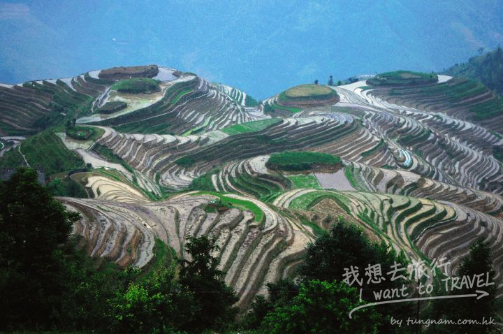 龍脊梯田距龍勝縣城27公里,距桂林市80公里,景區面積共66平方公里。共分為平安壯族梯田和金坑紅瑤梯田 。平安梯田集中在平安寨,有七星伴月和九龍五虎兩個景點和附近的龍脊古村。金坑梯田位于大寨地區,由大 寨、田頭、壯界、新寨、小寨五個寨子組成,主要觀景在田頭寨和大寨。龍脊整個梯田群分布在海拔300- 1100米之間,坡度大多為26-35度,最大坡度可達50度。梯田一層層從山腳盤繞到山頂,小山如螺,大山似塔 ,層層疊疊,高低錯落。在梯田的海洋里,最大的田不過一畝,大多數田都是只能種一二行禾的“帶子丘”和 “青蛙一跳三塊田”的碎田塊。梯田一年四季景觀各異,景象可稱得上是人間一大奇觀。