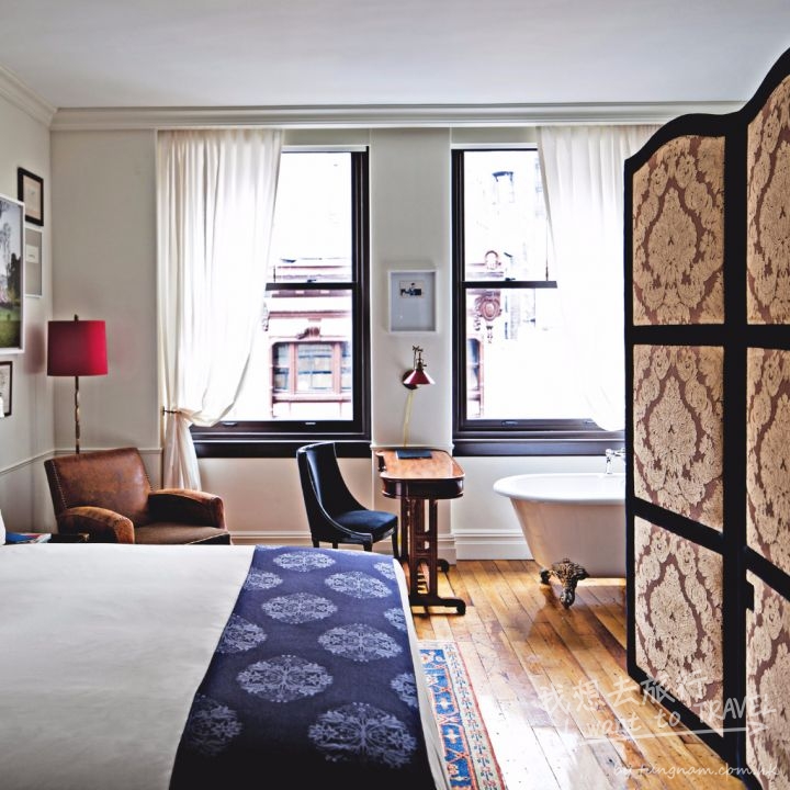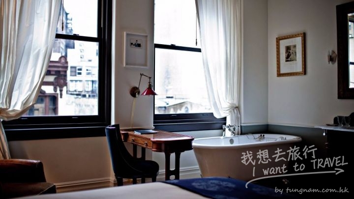 Atelier Room 房間內有 king-size 大床、桃花心木書桌、皮椅,仲有一道低調但華麗嘅間隔簾,空間不算大,感覺 cozy,房間仲有 claw-foot 浴缸,畀情侶們可以好放鬆地欣賞到美國街頭嘅熱鬧場面。