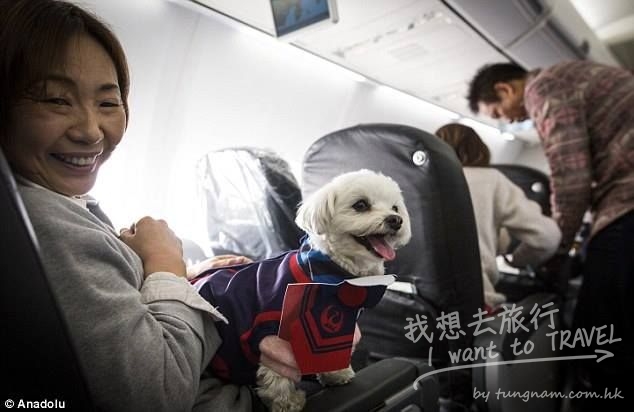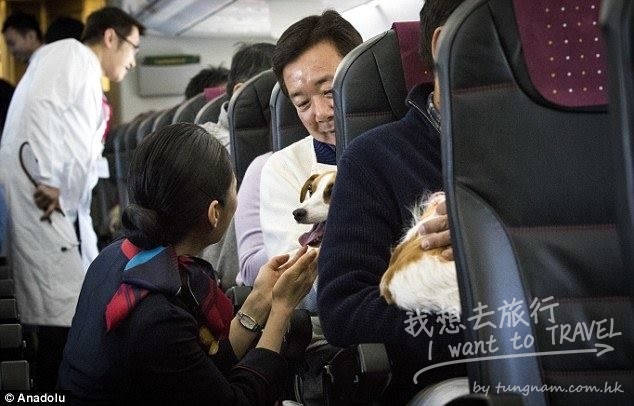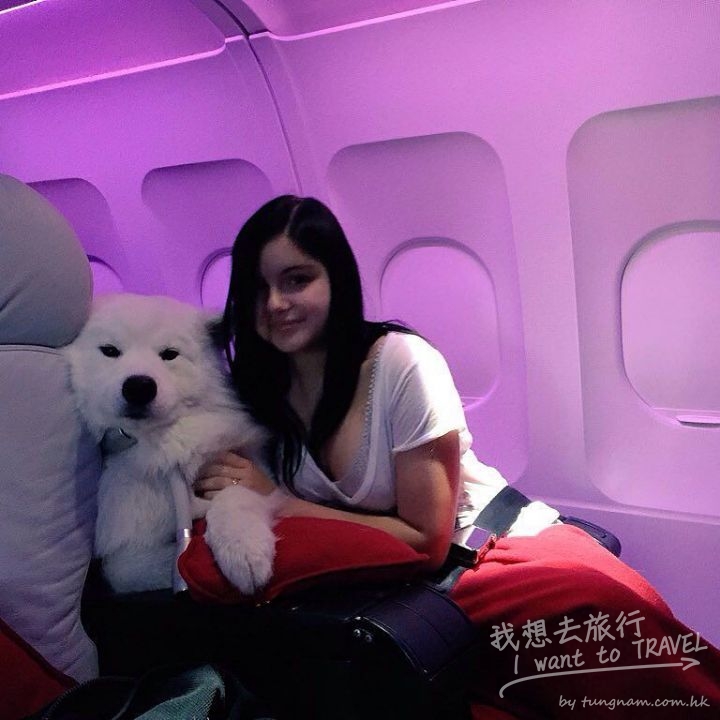 不過讓狗狗一起搭機不意味著牠可以在機艙到處走動,而是關在籠子裡面被固定在靠窗的座位,全程有獸醫陪同。