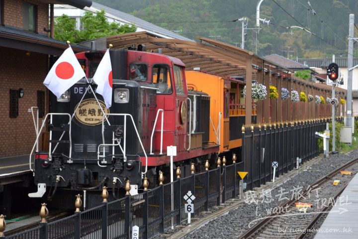 嵯峨野游覽列車,這是利用JR山陰線嵯峨嵐山和馬堀之間的舊線路開設的遊覽行程。一路上可飽嘗櫻花、新綠、紅葉等保津川的 溪谷之美。單程25分 , 全天往返8次。此行程還可與保津川乘船遊覽行程接軌。