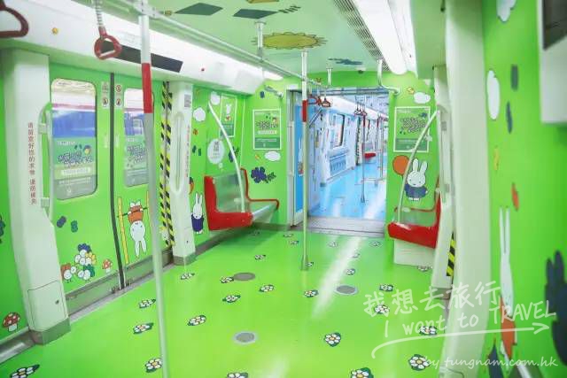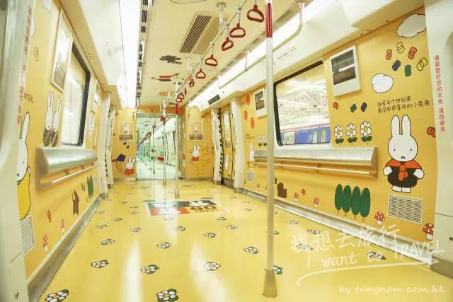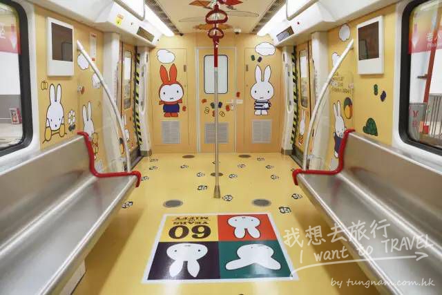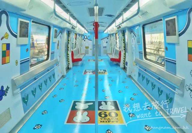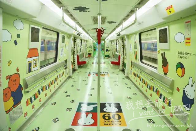 Miffy卡通列車被分成4鐘不同主題顏色,代表Miffy衣服的顏色。Miffy卡通列車顏色鮮艷,地板印上卡通小花,四周都是可愛的Miffy小兔子. 愛Miffy的朋友一定唔想落車!