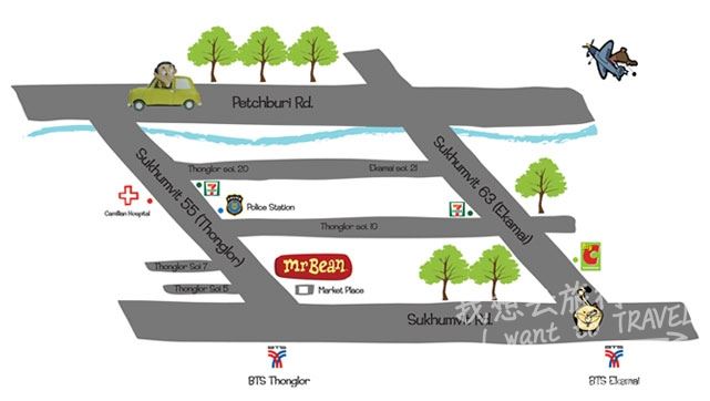 泰國現時有三間戇豆咖啡,布置風格如出一轍,以多個動畫版的《Mr Bean》圖像裝飾牆壁。並擺放了典型英倫家居必備的深啡色皮梳化,多了一份家的親切感;此外,也有不少戇豆精品售賣,如Q版戇豆Figure、T恤及招牌熊仔布偶等,而掛牆大電視更不停播放戇豆的電視劇及動畫系列,讓粉絲們回味一番。