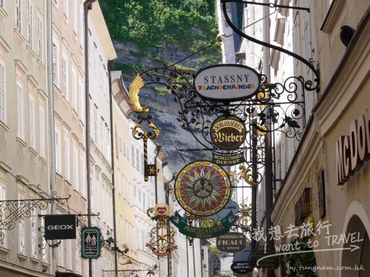 糧食胡同(Getreidegasse)位於薩爾茨堡老城區,與大教堂毗鄰,它是薩爾茨堡最繁華、也是最具魅力的購物街。石板鋪就的街道十分狹窄,但也別有風情。這裡常年遊人如織,熙熙攘攘,熱鬧非凡。街道建築糧食胡同的街道兩旁的建築完好得保留了中世紀的風格,色彩各異,裝飾著精美的浮雕和飛簷。每座建築的立面上都清楚地寫著建造的年代,每家商號都有自己的精美招牌。用金屬打造出來的,十分醒目,為了讓不認識德語的遊客了解自己的商品,許多店家更是在招牌上加了標誌性的商品圖案,走在條石板路上抬頭看,各具特色的鑄鐵招牌爭奇鬥艷,堪稱糧食胡同的一道靚麗風景線。街道店鋪這裡的商品琳瑯滿目,從奢侈品、高街品牌到金銀首飾、手工藝品應有盡有,精心佈置的櫥窗也是一道靚麗的風景線。糧食胡同12號的老字號文具店Hackernbuhner出售製作精良的皮質文具和其他高級文具用品,充滿童趣的兒童玩具也是他家的一大特色,是不錯的禮物。在糧食胡同17號,你可以找到充滿薩爾茨堡傳統民族風情的各色服裝,設計師將民俗特點和現代元素相結合,服裝設計充滿了時尚感。